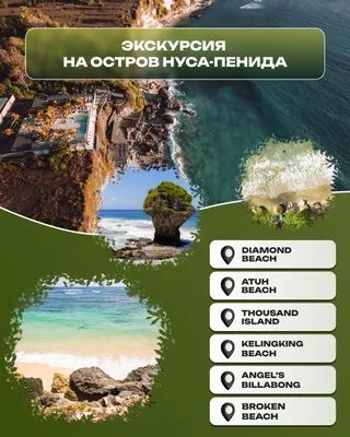 Во время тура вы посетите легендарные пляжи и природные достопримечательности, которые уже стали визитной карточкой острова: от Diamond Beach с белоснежным песком и кристально чистой водой до Kelingking Beach — места, известного во всём мире своим видом в форме динозавра. Вы также прогуляетесь по скальным смотровым площадкам, окунётесь в атмосферу покоя на пляже Atuh, насладитесь видами архипелага с Thousand Island Viewpoint, а также увидите уникальные природные чудеса — Angel’s Billabong и Broken Beach.