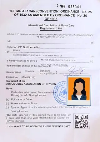 - Временное шри-ланкийское водительское удостоверение (оформляется на месте)