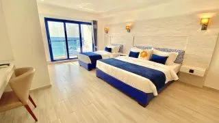 - Четырехместный номер Делюкс с балконом и видом на море. Идеально подходит для компаний или семей, предлагая комфортное размещение с шикарными видами.