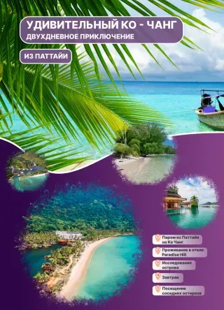 Откройте для себя красоту Острова Принцессы, одного из самых завораживающих мест Паттайи, с нашей уникальной экскурсией. Насладитесь удобным трансфером прямо из вашего отеля, которые включает в себя каждого участника вашего приключения. Экскурсия по доступной цене в 2100 бат для взрослых и 1600 бат для детей обещает день полный открытий и впечатлений для всех желающих исследовать этот райский уголок.