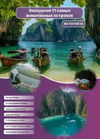 Погрузитесь в мир райских пейзажей, кристально чистой воды и незабываемых приключений в рамках насыщенного тура на 11 островов. Вас ждут уникальные пляжи, таинственные пещеры, места съёмок культовых фильмов и невероятные виды с панорамных площадок. В рамках данного тура вы осматриваете остров Панак, зеленый остров с высокими скалами, скрывающими лагуны и пещеры. Знаменитый Као Пинг Кан с видом на остров Та Пу, прославленный в фильме о Джеймсе Бонде «Человек с золотым пистолетом». Посещение деревни Паньи - деревни морских цыган, построенная на сваях. Здесь вас ждёт обед в местном ресторане с видом на море. Остров Хонг - пляжный отдых, купание в бирюзовой воде и подъём на смотровую площадку с панорамой архипелага. Осмотр с воды Пхи-Пхи Дон, лагуны Пиле и лагуны Майя.