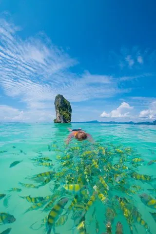 После Кхай маршрут ведёт в лучшие точки для сноркелинга вокруг Пхи-Пхи. Это настоящие аквариумы под открытым небом: разноцветные рыбки, кораллы, спокойная вода — идеальное место для тех, кто любит подводный мир. Гид подскажет самые живописные локации, а оборудование уже включено в стоимость.