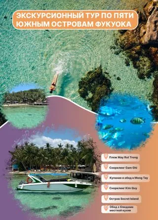 Тур по 5 Южным островам Фукуока — это целый день на пляжах, снорклинге и обеде из свежих морепродуктов. Маршрут охватывает острова May Rut Trong, Gam Ghi, Kim Quy и секретный остров, предоставляя возможность насладиться как природной красотой, так и культурными открытиями острова.