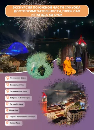 Экскурсия по южной части Фукуока предлагает насыщенную программу, в рамках которой вы посетите жемчужную ферму, познакомитесь с местной жизнью на винодельне Сим и перцевой плантации, узнаете о процессе приготовления рыбного соуса и исследуете пагоду Хо Куок с ее живописными видами. Обед на пляже Сао и посещение Sunset Town с его средиземноморской атмосферой и достопримечательностями завершат ваш день.