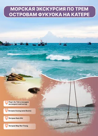 Экскурсия "Три острова" — это незабываемое приключение, позволяющее вам насладиться подводным миром и потрясающими пляжами Фукуока. Этот тур подходит для всех желающих провести день в окружении тропической природы, где вы сможете не только исследовать коралловые рифы, но и расслабиться на белоснежных пляжах. В ходе экскурсии вы получите возможность насладиться свежими морепродуктами на лоне природы и ощутить всю красоту вьетнамских островов. Это идеальный способ провести время с семьей или друзьями, наслаждаясь активным отдыхом и великолепными пейзажами, которые запомнятся вам на всю жизнь.
